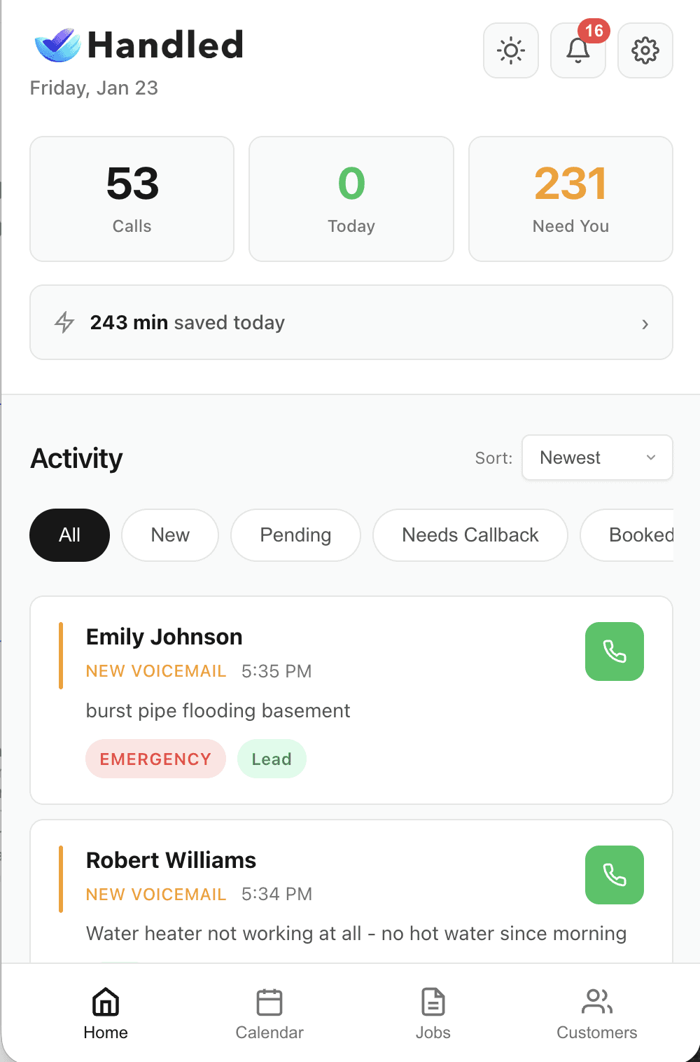 Never miss another call, Handled’s AI answers 24/7, greets your customers professionally, gathers details, and books jobs based on your calendar. Say goodbye to lost opportunities and hello to growing your business.